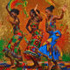Rhythms in Colour – Black History Celebration. Three African dancers move as one, their bodies echoing the unseen beat of drums. Vibrant colours of red, green and blue becomes rhythm, fabric becomes motion, and gesture becomes memory. Set against a gold ground, the figures feel timeless rather than staged, celebrating joy passed down through generations. The dance is not performance alone - it is identity expressed through movement, balance, and shared cultural pulse. A celebration of Black history.