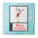 Carrelage en céramique avec une jolie illustration fantaisiste d'un drôle de renne de Noël dans un pull moche, parfait pour la saison des fêtes. Il se tient debout sur 2 jambes et brave bonjour. Il a de gros bois et un mignon casquette d'hiver tricoté vert. Texte ci-dessous dit Joyeux Noël dans une police manuscrite dans une couleur rouge festive. L'arrière - plan est un design d'aquarelle bleu gelé.