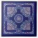 Dessin d'un vitrail d'une ancienne église européenne : une fenêtre rose, avec des touches de couleurs variées, dont des tons bleus, sur un arrière - plan bleu marine. Inposition de strass bleus. Ce motif est également disponible en rouge cardinal dans mes collections "cardinal rouge rosace".