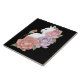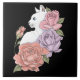 Profil d'un chat blanc avec des roses roses, pêche et lavande dans un fond noir