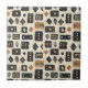 Earthy geometric pattern ceramic tile inspired by tribal mudcloth textiles, featuring hand-painted rectangles, diamonds, and triangles in charcoal black and terracotta on a textured beige background. A warm boho design ideal for rustic décor lovers, artisan style fans, and anyone drawn to earthy geometric aesthetics.