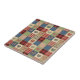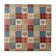 Warm rustic patchwork pattern ceramic tile featuring stitched heart motifs, plaid checks, and country-style fabric blocks in red, blue, green, and beige tones. A cozy farmhouse-inspired design ideal for country decor lovers, quilting fans, and rustic home enthusiasts. Perfect as a heartfelt gift for couples, moms, or cottage-style fans