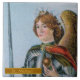 Dans ce tableau Trois Archanges et Tobias de Francesco Botticini (1446-1498), maitre mineur de la Renaissance italienne primitive, St. Michael monte la colonne des voyageurs vêtus d'une armure à plaques contemporaine du XVe siècle. Bras d'épée tendu, il tient son arme au point, prêt à affronter tout danger sur la route. St. Michael a des cheveux auburn, un halo ouvert blanc, des chaussures rouges, une cape rouge courte avec une doublure verte, et des ailes foncées. Dans sa main libre, il tient un orbe, un symbole d'autorité, ou un poids, une référence à son rôle dans la pesée des âmes au jugement Dernier. + Fête : 29 septembre + Crédit photo (M 017) : Détail de Trois Archanges et Tobias, par Francesco Botticini (1446-1498), température sur panneau, 60 5/8" x 53 1/8" (154cm x 135cm), Florentine, Italie, ca 1. 470, Galerie des Offices, Florence, Italie. {{PD-Art|PD-old-100}}. Carte postale Stengel antique de la collection privée du designer.