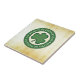 SlipperyJoe's Saint Patrick's Day vernis trois feuilles trèfle vert émblème circulaire gras centré fond texturé artistique parchemin comme petits icônes irlandais blancs lettres majuscules blanches légèrement relevées effet tridimensionnel lettrage courbes autour forme sphérique bouton brillant ombre subtile profondeur cadeaux célébrant LGBTQIA tons beige chaud et doré aspect dimensionnel poli