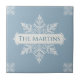 Snowflake pattern blue & white holiday custom name ceramic tile. You can edit the text in the center, change the font, change the color, size, etc. Gift these tiles as custom name coasters for each family member, for friends or teams, use them for home accents on your bookshelves, in your living rooms and bedrooms, or as mosaic wall art with other tiles. Or leave the central space empty, and use as decorative backsplash ceramic tiles.