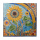"tournesols jaunes", "tournesols sur vert foncé", "bleu-orange turquoise", "mosaïque de style gaudi", "design inspiré de van gogh", "jardin d'été", "tête de fleur décorative", "carreaux de céramique fleurie ornementale", "été heureux et coloré", "bleu ciel amusant"