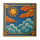 Voyagez vers un royaume de ciels vibrants avec cette tuile décorative captivante. Doté d'un soleil radieux et de nuages spectaculaires. Une riche palette de bleus, d'oranges et d'or, cette pièce décorative d'accent ajoute une touche mystique et énergique à tout espace. Parfait pour insuffler à votre maison la "puissance" et la beauté des éléments. La bordure dorée aux élégantes fleurs d'angle apporte une touche d'art classique. Ses couleurs audacieuses et son design complexe confèrent un caractère puissant et artistique. Le soleil stylisé et les nuages dynamiques de bleus, d'oranges et d'or riches créent un récit visuel fascinant. Un accent idéal pour ceux qui recherchent une oeuvre à la fois artistique et symbolique.