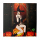 "Sorcière du Trône Citrouille" Une sorcière aux cheveux roux envoûte sur une lanterne branlante, encadrée par une fenêtre gothique voûtée et un décor de forêt féerique et enchanteur. Avec des citrouilles brillants à ses pieds et un regard espiègle, elle apporte un glamour sombre à la nuit d'Halloween.