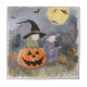 L'image montre deux enfants vêtus de costumes de sorcière devant un grand citrouille. L'arrière - plan est sombre avec une pleine lune et des chauves-souris dans le ciel. L'image est un tableau aquarelle avec un thème éffrayant et fantaisiste.