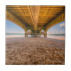 Photo prise sous une jetée montrant la jetée, l'océan, le ciel, la plage avec des empreintes de pieds dans le sable.