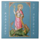 Selon la tradition, Sainte Marguerite (ou Sainte Marina le Grand Martyr) a fixé sa vie pour le Christ pendant la persécution de Dioclétien au début du quatrième siècle. Bien qu'elle soit un célèbre martyr vierge, ironiquement elle est la sainte patronne des femmes enceintes et des femmes en travail. Le diable sous couvert de dragon, comme le raconte cette histoire d’origine inhabituelle du patronage, l’a avalée toute entière. Cependant, la croix qu’elle portait irritait tellement les entrailles du dragon qu’il l’a ramenée ou rompue pour se débarrasser d’elle. Même si les papes et les hagiographes médiévaux jugeaient cette histoire fantaisiste, elle fut néanmoins adoptée par les laïcs et les artistes, ne serait-ce que pour son symbolisme. Et la croix et le dragon ont été ses principaux attributs depuis. + Cette image de St. Margaret est particulièrement attrayante. La sainte, dont la beauté était légendaire, se dresse sur le dos d'un grand dragon vert qui touffe son manteau avec ses dents. Elle est couronnée d'une guirlande de roses, ses longs cheveux blonds qui coulent sur ses épaules. Elle porte un manteau rose vif sur une tunique blanche contre un arrière - plan bleu à motifs de petits points blancs et d'étoiles. + Cette gamme de produits met l’accent sur le parrainage de la grossesse et de l’accouchement par St. Margaret. Les couleurs dominantes rose et bleu cravate bien avec la coutume moderne d'utiliser ces couleurs pour les bébés filles et garçons. La doublure jaune doré du manteau permet un thème neutre pour le genre. + Fête : 20 juillet + Crédit photo (SAU 038) : Empreinte dorée néogothique antique à la frontière florale de St. Margaret [d'Antioche]", initialement publiée en chromolithographie par la Société de St. Augustin, Bruges, Belgique, fin 19ème siècle, de la collection privée du designer de l'ère religieuse.