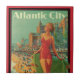 Illustration vintage d'art de l'affiche de voyage aux États-Unis d'Amérique pour Atlantic City, New Jersey via le chemin de fer de Pennsylvanie, représentant une belle femme blonde pin-up dans un maillot de bain tenant une serviette regardant le soleil sur la plage pendant l'été. Les gens s'amusent sur la plage et la promenade. Atlantic City est une ville de villégiature connue pour ses jeux, son shopping et sa gastronomie.