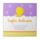 Cette tuile mignonne et amusante présente un adorable canard jaune en bulles de bain savonneuses blanches sur un arrière - plan violet clair avec un ruban orange et des rayures jaunes. Le texte combine écriture manuscrite et polices sans serif pour un look élégant et moderne. Il peut être personnalisé avec les statistiques de naissance de votre bébé, comme le nom, la taille, la date et l'heure de naissance, ou si vous souhaitez le donner comme cadeau de douche vous pouvez modifier et supprimer du texte.