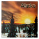 L'hiver dans la taïga arctique. Avec le soleil bas à l'horizon la neige brille et le ciel brûle orange et jaune. Le texte "Alaska" apparaît également que vous pouvez facilement supprimer si vous le souhaitez. Ajoutez votre propre texte supplémentaire.