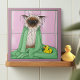 Un chat siamois tremble mouillé d'avoir un bain. Le chat a une serviette verte autour d'eux et leur canard en caoutchouc sur fond de carreaux de bain roses. Le chat n'est pas content du bain.