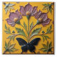 A square tile with a yellow background, featuring a raised floral design with three large flowers with purple petals and yellow centers, green stems, and green leaves. A black butterfly is positioned at the bottom center of the tile. Additional floral elements are placed in the corners.