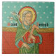 Dans ce détail d'une empreinte dévotionnelle belge du 19ème siècle, un St. Joseph aux cheveux gris mûrs se dresse devant un mur rouge suspendu à une garniture jaune doré. La tapisserie est tapissée de croix à armes égales enfermées dans des carrés rotatifs. Son accrochage défie l'explication logique, car l'arrière - plan est constitué d'un ciel bleu-aqua infiniment profond, obscurci d'étoiles. + Saint-Joseph est richement garni de couleurs fortes. Sa robe est rouge, son manteau, vert avec une doublure d'aqua foncé et des bordures jaunes dorées. Il tient un spray de lys blancs symbolisant la pureté dans sa main droite et une règle de menuisier brun en L qui témoigne de sa profession dans sa gauche. Sous les pieds sablés de Saint-Joseph sur l’image pleine longueur qui apparaît, par exemple, sur nos cartes de voeux et nos affiches dans cette COLLECTION, il y a d’autres attributs - un petit dragon, une couronne, un rouleau et un globe portant les noms des continents peuplés - qui parlent de son rôle de protecteur de l’Église. + Cette lithographie chromo- ou couleur a été publiée à l'origine pour promulguer "Prière à saint Joseph" du Pape Léon XIII de 1889. + Fête principale de saint Joseph : 19 mars ; Fête de saint Joseph le travailleur : 1 mai + Crédit d'image (VVP 09) : Détail d'un chromolithographe antique de saint Joseph, protecteur de l'Église, Priez pour nous [H. Jozef, beschermer der H. Kerk, B.V.O.] initialement publié par K[arel] v[an] d[er] Vyvere-Petyt, Bruges, Belgique, c. 1890, de la collection privée de l’éphémère religieuse du designer.