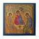 L'oeuvre/icône Antique Andrei Rublev représentant le Père, le Fils et le Saint-Esprit assis à une table. Les images semblent avoir des ailes d'anges.