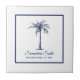Ajoutez votre touche spéciale à ce design simple et élégant, avec votre nom de famille ou votre phrase, date et palmier en bleu marine, encadré dans une bordure bleu marine sur un arrière - plan blanc.