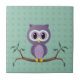 White Ceramic Tile a un mignon chouette chouette chouette en caricature violette sur un membre avec un arrière - plan de motif à pois vert. Personnalisable.