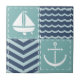 Un motif de carrés turquoise orageux d'inspiration courtepointe, décoré d'un voilier et d'une ancre blancs, et de carrés bleu marine profond, agrémentés de chevrons et de vagues bleus de paler, est accentué par la couture blanche pour créer une atmosphère nautique classique. Cette tuile peut être encadrée pour créer une trivette ou placée à l'intérieur d'un couvercle de boîte-cadeau en bois. Les carreaux sans cadre s'insèrent également dans la grande boîte à cadeaux pour créer un ensemble correspondant.