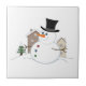 Illustration d'un bonhomme de neige de Noël en dessin animé sur une scène de neige avec des maisons recouvertes de neige et un arbre dans le arrière - plan.