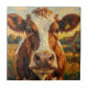 Un carreau de céramique d'animaux de ferme mignons avec une vache de style impasto mignonne debout dans une ferme. Gros plan sur son visage et un arrière-plan de ferme.