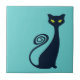 Silhouette de chat noir rétro classique avec queue en spirale et yeux verts inclinés. Haut pommettes et oreilles de chauve-souris.