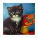 Carrelage avec un beau chat Van Gogh tuxedo ! Ce petit chaton pose à côté d'un panier de fleurs orange sur une table rouge. Un grand cadeau pour les amoureux de les chats et les collectionneurs d'art hollandais !