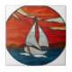 Cette belle photo comporte mon voilier à la conception d'art en verre souillé de coucher du soleil.