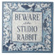 "Attention au Studio Rabbit" lit ce panneau ou trivet de tuiles. N'importe quel amoureux de lapin lapin lapin appréciera ceci! Mon dessin de tuiles peintes à la main en bleu et blanc ressemble à de vieilles tuiles Delft craquelées, et la bordure et les lapins rappellent les vieux motifs de poterie Dedham. Art & design original par Tuzi Williams.