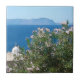 Aquarelle vue mer avec fleurs en fleurs, clocher blanc et vue mer et montagne dans une île grecque
