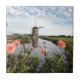 Photo tile with a wind mill and a canal with pink dahlia flowers in a landscape in Holland.