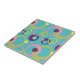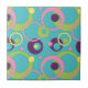 Un arrière - plan bleu vif est décoré d'un motif funky de cercles, de points et d'anneaux dans une variété de couleurs vives, dont le rose, le vert, le violet et le jaune. Cette tuile peut être encadrée pour créer un trivet ou placée à l'intérieur d'un couvercle de boîte cadeau en bois. Les carreaux sans cadre s'intègrent également dans la grande boîte cadeau pour créer un ensemble correspondant.