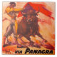 Ce design a été créé à l'aide d'une affiche de l'après-guerre qui marque la promotion du voyage après la période chaotique. Cette affiche aux couleurs chaudes a été créée pour attirer les gens au Pérou via Panagra Air. Dans cette conception, le taureau vigoureux tourne vers le torero, qui élève avec élégance et confiance la mulette rouge. L'action du taureau et le mouvement du tissu sont si rapides et puissants que le périphérique des images devient flou. Le PERU par PANAGRA se trouve en haut et en bas de la conception en gras en rouge. Nous avons créé une collection de produits utilisant ce design appelé ‘Vintage Peru Via Panagra Travel Collection’.