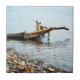 Une photo d'un arbre mort a emporté un rivage sur une plage rocheuse.
