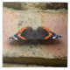 Cette magnifique tuile présente une photo d'un beau papillon de l'amiral rouge (Vanessa atalanta). Cette espèce est principalement noire avec des taches blanches et de belles bandes rouges sur ses ailes. La photo montre le papillon, avec ses ailes larges ouvertes, reposant sur un mur de briques en regardant la caméra. La photo a été prise en utilisant la macro photographie pour un résultat détaillé.
