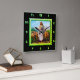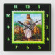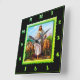 Jésus Bon Pasteur vert horloge carré.Jésus avec ses moutons marchant dans un champ avec eux tous le regardant. Avec un ciel bleu clair et de l'herbe verte derrière eux.Et il a une tenue blanche sur la tenue d'un bébé mouton.Ceci est une photo vintage du début de 1900.Jean 10:7-21 Je suis le Bon Berger