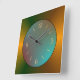 Une horloge de cuisine simple et attrayante avec des reflets d'or. Un centre rond avec vert aqua et des touches de rouge.Une fine bordure noire avec des mains noires complètent le design. Disponible en forme ronde et carré.