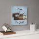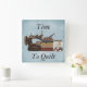 N'importe quel moment est le bon moment pour courtepointe. Cette adorable horloge "Time to Quilt" présente l'image d'une machine à coudre antique, une pile de tissu et un pot de boutons sur un arrière - plan bleu pâle; tous prêts à droite "Time to Quilt".