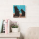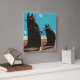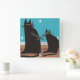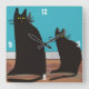 Horloge d'art Whimsical Black Cats, deux adorables chats noirs "Où est notre dîner ?", attendant patiemment dans la cuisine. Artiste dessiné à la main de l'art du chat sur un arrière - plan turquoise bleu et marron.