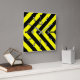 Cette horloge carré est décorée d'un motif de type chevron noir et jaune. Il comporte également des rectangles qui marquent les heures, et des chiffres qui indiquent les heures "12", "3", "6" et "9".