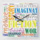 Ce dessin présente un vocabulaire relatif à l'écriture de fiction. Les mots sont définis en plusieurs polices et couleurs et arrangés en art des mots. Ces éléments sont placés contre un arrière - plan blanc. Cette conception est disponible sur les autres modèles d'horloge.