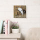 Heron (aigret) debout dans les herbes marécageuses séchées. Chiffres blancs avec ombre portée. L'oeil jaune et le bec orange se distinguent nettement, avec les plumes blanches et les pattes grises.