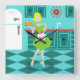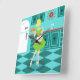 Avec cette horloge murale en acrylique de cuisine rétro, vous pouvez avoir votre tarte et le manger, aussi. Ce dessin d'art kitsch et minimaliste présente une femme au foyer des années 50, dans sa cuisine moderne du milieu du siècle. Le beau boulanger porte une robe verte et bondissante et un tablier blanc aux détails rouges. Pas un cheveu sur sa tête blonde n'est déplacé. D'une part, elle tient le fruit de son travail, une magnifique tarte aux fruits surmontée d'un treillis. Un coup d'oeil et vous saurez que ses croûtes de tarte grinçantes sont sans égal. Elle est debout sur un aqua et un damier turquoise, qui est sans aucun doute assez propre pour se nourrir de. Contre un mur d'aqua, on voit une cabane turquoise avec des garnitures d'aqua, un plan rouge, des tiroirs rouges et des accents d'starburst noir. Une horloge rouge d'étoile est suspendue au mur. Sur le côté, on trouve un frigo blanc dernier cri avec poignées en argent. Au moins, le réfrigérateur était à la pointe de la technologie dans les années 1950. Maintenant, c'est juste du rêve ! Que vous soyez Suzie Homemaker ou que vous ayez simplement une affinité pour tout ce qui est vintage, vous êtes sûr d'aimer cette tranche délicieuse d'Americana.