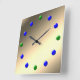 Une horloge sans numéro qui s'inspire d'une horloge murale dans notre "nouvelle" maison dans les années 1960. Les boules vertes s'asseyent aux 12, 3, 6 et 9 positions; Les boules bleues aux autres points de numéro. L'Arrière - plan est d'apparence métallique dorée.
