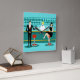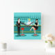 Chaque heure est l'heure heureuse avec ce Retro Cocktail Lounge Acrylique Mur Horloge. Le design moderne du milieu du siècle présente un dessin animé minimaliste et animé de style années 1960 d'un bar à cocktails élégant. Sur fond de mur d'aqua, on peut voir des rangées de verres de boisson. Au moins, on peut voir les silhouettes turquoises des lunettes de boisson. A en juger par les formes de la tige, ce bar est bien équipé pour mouiller votre sifflet, quelle que soit votre préférence de boisson. Un barman des plus compétents et personnalisables est le bar turquoise aux accents jaunes. Le jeune bardonte porte une chemise blanche immaculée avec cravate arc noir. Son apparence fraîche, ses cheveux blonds et ses lunettes noires de hipster nous donnent toutes les raisons de croire qu'il passe ses journées en tant qu'acteur en difficulté ou en tant que super-héros. D'un côté, le beau mixologiste donne un martini à un client de l'autre côté du bar. Le client en attente est un gentleman à larges épaules en costume noir et cravate rouge. C'est le genre de gars qui est décrit comme grand, sombre et beau même quand il reste des heures jusqu'à la fermeture. Il semble y avoir un tabouret rouge et chrome avec le nom de M. Debonair dessus. Mais pour ne pas être présomptueux, il pose la question : "Pardonnez-moi. Est-ce que ce siège est pris ?" Il demande à la fille aux cheveux raven sur le tabouret du bar voisin. C'est une vraie "fille d'à côté", si vous vivez à côté d'une beauté impeccable avec un personnage qui ne démissionnera pas. Elle porte une robe noire et tient un martini d'une main. Elle espère qu'elle et l'homme approchant ont plus en commun que leur préférence pour la boisson et le choix de la couleur de l'armoire. On dirait que ce soir est devenu intéressant. Bravo !