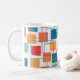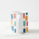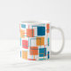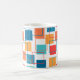 Cette tasse a un design géométrique de carrés en mandarine, pavot, corail et des nuances de turquoise éparpillés avec leurs contours.