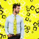 Une cravate rétro cool avec un motif de carrés aléatoirement placés en noir et blanc sur le jaune néon.