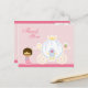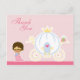 Cette carte postale de remerciement a un thème de princesse mignonne. Sur le devant, une princesse aux cheveux blonds se tient à côté d'une calèche royale. Il y a un arrière - plan de polkadot rose et blanc. À l'arrière, on trouve un arrière - plan de polkadot rose et blanc avec un bord de pétoncle rose en haut et en bas. Il y a une glissière en verre sur un coussin dans le coin inférieur. Vous pouvez facilement customiser votre message de remerciement au dos. Copyright © Zenware Designs